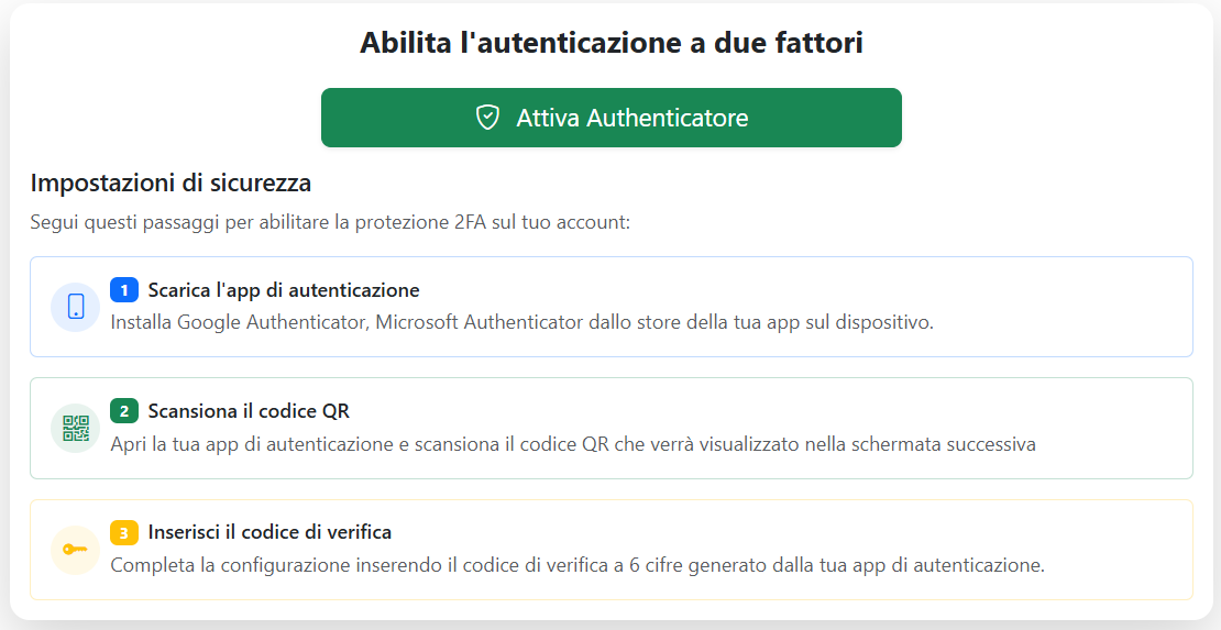 - Se l'Authenticator non è ancora attivo, l’utente viene portato alla pagina di attivazione dell’Authenticator.